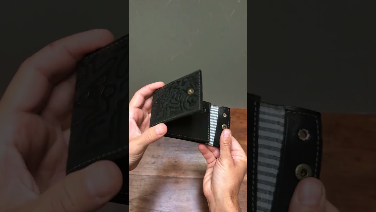 Billetera fabricada en cuero vacuno con botón. Cuenta con tres divisiones, un visor y capacidad para 10 tarjetas.